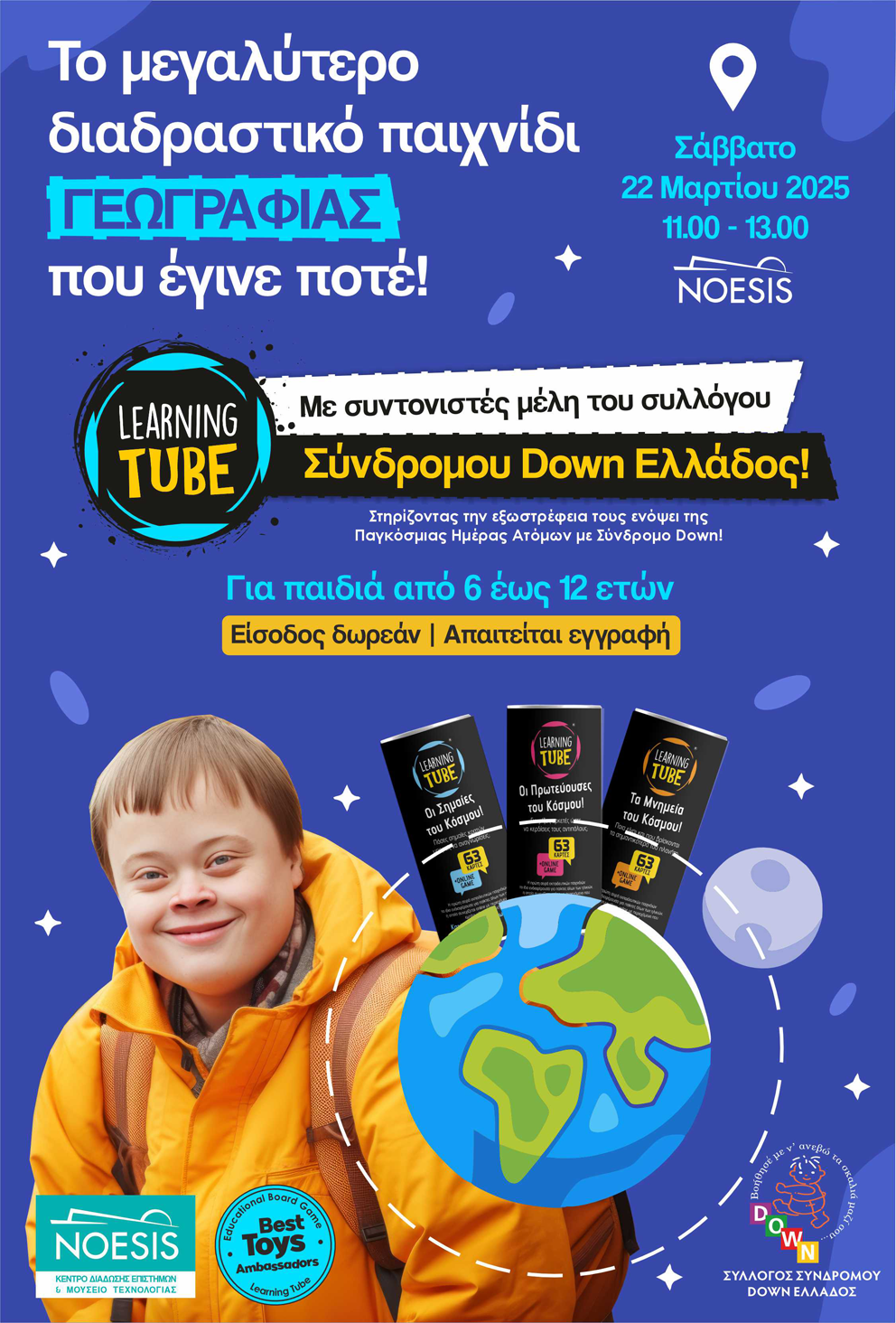Τα εκπαιδευτικά παιχνίδια Learning Tube και η K-TOYZ σας προσκαλούν στο μεγαλύτερο διαδραστικό παιχνίδι γεωγραφίας που έγινε ποτέ! Η εκδήλωση θα πραγματοποιηθεί το Σάββατο 22 Μαρτίου 2025, από τις 11:00 έως τις 13:00, στο Κέντρο Επιστημών και Τεχνολογίας ΝΟΕΣΙΣ στη Θεσσαλονίκη.