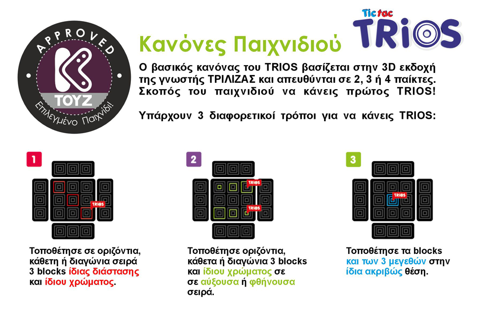Το TRIOS! είναι το επιτραπέζιο που θα κλέψει την παράσταση το 2025! Κυκλοφορεί αποκλειστικά στην Ελλάδα από την K-TOYZ, που εδώ και χρόνια διακρίνεται για την επιλογή ποιοτικών, εκπαιδευτικών και καινοτόμων παιχνιδιών. Αν ψάχνετε ένα επιτραπέζιο που θα δοκιμάσει το μυαλό σας, θα σας διασκεδάσει και θα σας κρατήσει σε εγρήγορση, τότε το TRIOS! είναι η ιδανική επιλογή.
