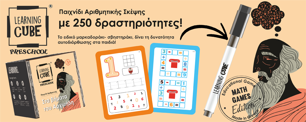Το παιχνίδι αυτό αποτελεί μια συλλογή 64 καρτών με περισσότερες από 250 μαθηματικές δραστηριότητες κλιμακούμενης δυσκολίας. Ο ξακουστός δάσκαλος της αρχαιότητας Αρχιμήδης, καθοδηγεί τα παιδιά σε ένα ταξίδι γνώσης που απαιτεί ταχύτητα και λογική σκέψη. Σκοπός του παιχνιδιού το παιδί (ή τα παιδιά) να ολοκληρώσουν με επιτυχία όλες τις αριθμητικές δοκιμασίες του δασκάλου Αρχιμήδη. Με τη βοήθεια του ειδικού μαρκαδόρου Learning Cube, τα παιδιά μπορούν να γράψουν, να σημειώσουν και να σβήσουν ατέλειωτες φορές πάνω στις κάρτες, να αυτο-διορθώνονται και να ολοκληρώνουν γρήγορα τις δραστηριότητες που απαιτούνται. Ένα παιχνίδι που θα κρατήσει δημιουργικά απασχολημένα τα παιδιά για ώρα, προσφέροντας τους πολύτιμες γνώσεις.