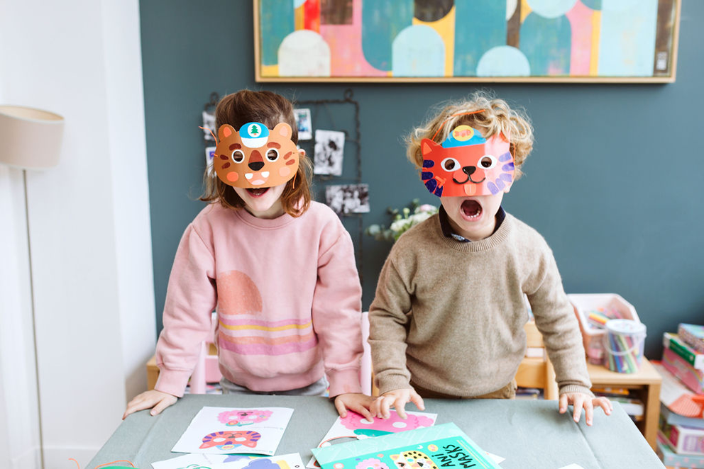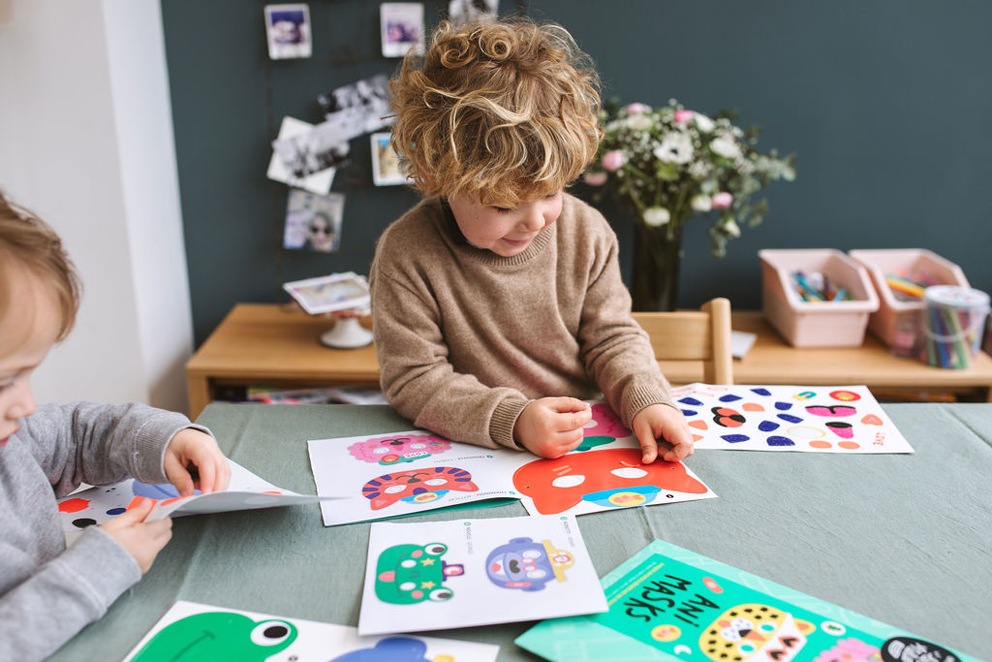 Τα παιδιά από την ηλικία των 3 ετών μπορούν να φτιάξουν τις δικές τους χαριτωμένες μάσκες με οδηγίες, υλικά και σχέδια υψηλής αισθητικής, σχεδιασμένα από βραβευμένους καλλιτέχνες και παιδαγωγούς. Η διαδικασία δημιουργίας μάσκας εμπλέκει το παιδί ενεργά: επιλέγει τα στοιχεία, διακοσμεί, κόβει, και φτιάχνει με τα χέρια του κάτι που μπορεί στη συνέχεια να φορέσει και να παίξει.