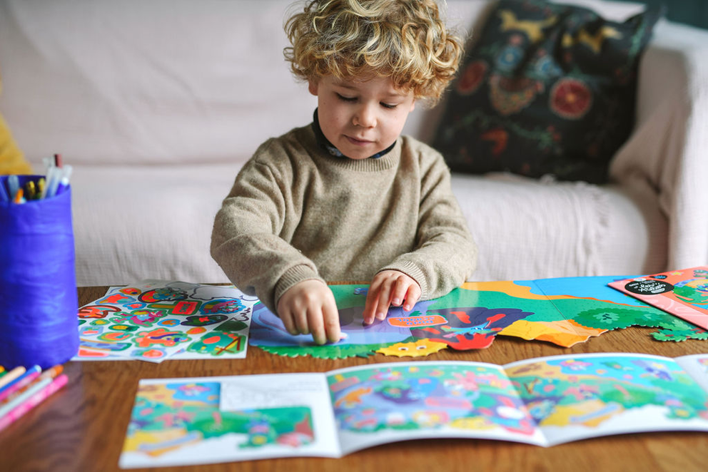 Η δεύτερη πλευρά της αφίσας προσφέρει την ευκαιρία για διακόσμηση με αυτοκόλλητα. Τα φωτεινά, φλουο αυτοκόλλητα ενισχύουν τη φαντασία και επιτρέπουν στο παιδί να πειραματιστεί με θέσεις, συνθέσεις και σχέσεις ανάμεσα στους χαρακτήρες.