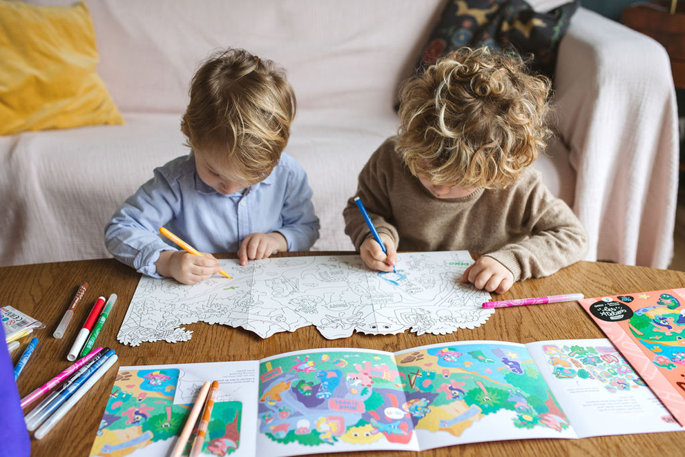🖍️ Μια τρίπτυχη, διπλής όψης αφίσα – από τη μία πλευρά για να τη χρωματίσεις, από την άλλη για να τη διακοσμήσεις με φανταστικά φλουο αυτοκόλλητα.